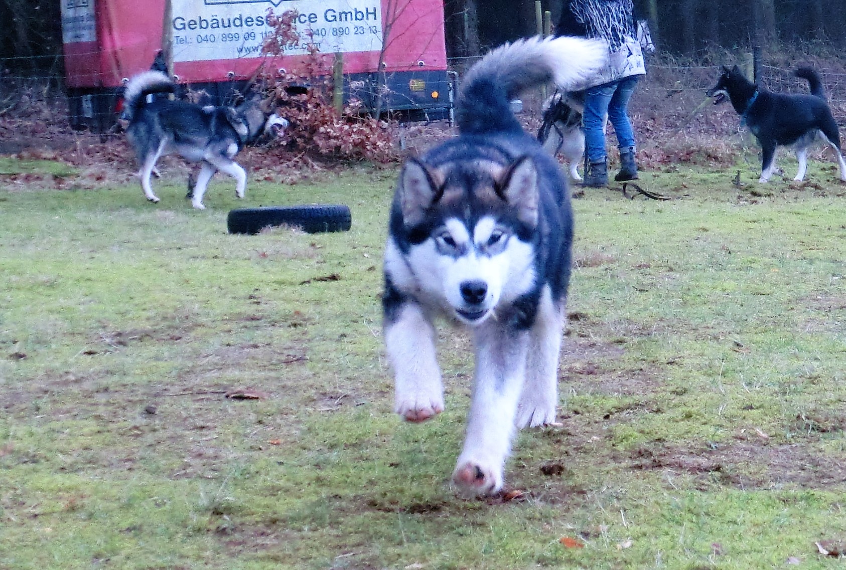 Dagegen läuft sie innerhalb eines Gespannes oder auch allein vor Fahrrad oder Roller zur Höchstform auf, gibt Vollgas bis zum letzten Meter und lebt in ihrem Rudel als sehr sichere ,ranghohe Hündin…..als Mutterhündin des A-Wurfes 2011 und des B-Wurfes 2013 zeigte sie, daß ihre Urinstinkte und Fähigkeiten allesamt die ihrer Vorfahren sind und sehr souverän abgerufen werden können.....mit Freya, ihrer Tochter Amitola, ihrer Enkelin Chephe und Tochter Dshamila bildet sie unsere kleine Mädels-Truppe in der ein unglaublicher Zusammenhalt besteht....