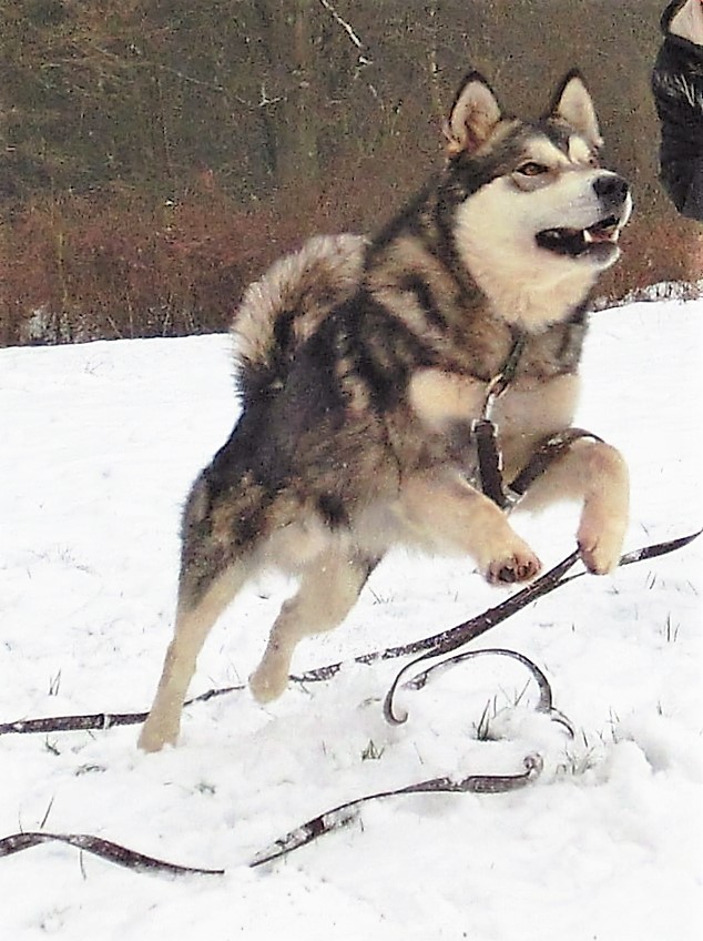Living in Woods Aponowi,"Paddel", Alaskan Malamute Rüde, geb.24.3.2011 - Wheel-Dog mit Ausnahmetalent, kann über lange Strecken mit effektivem Zug schnell und ausdauernd traben.Für die Arbeit im Gebirge stellt er die Bank fürs Team.